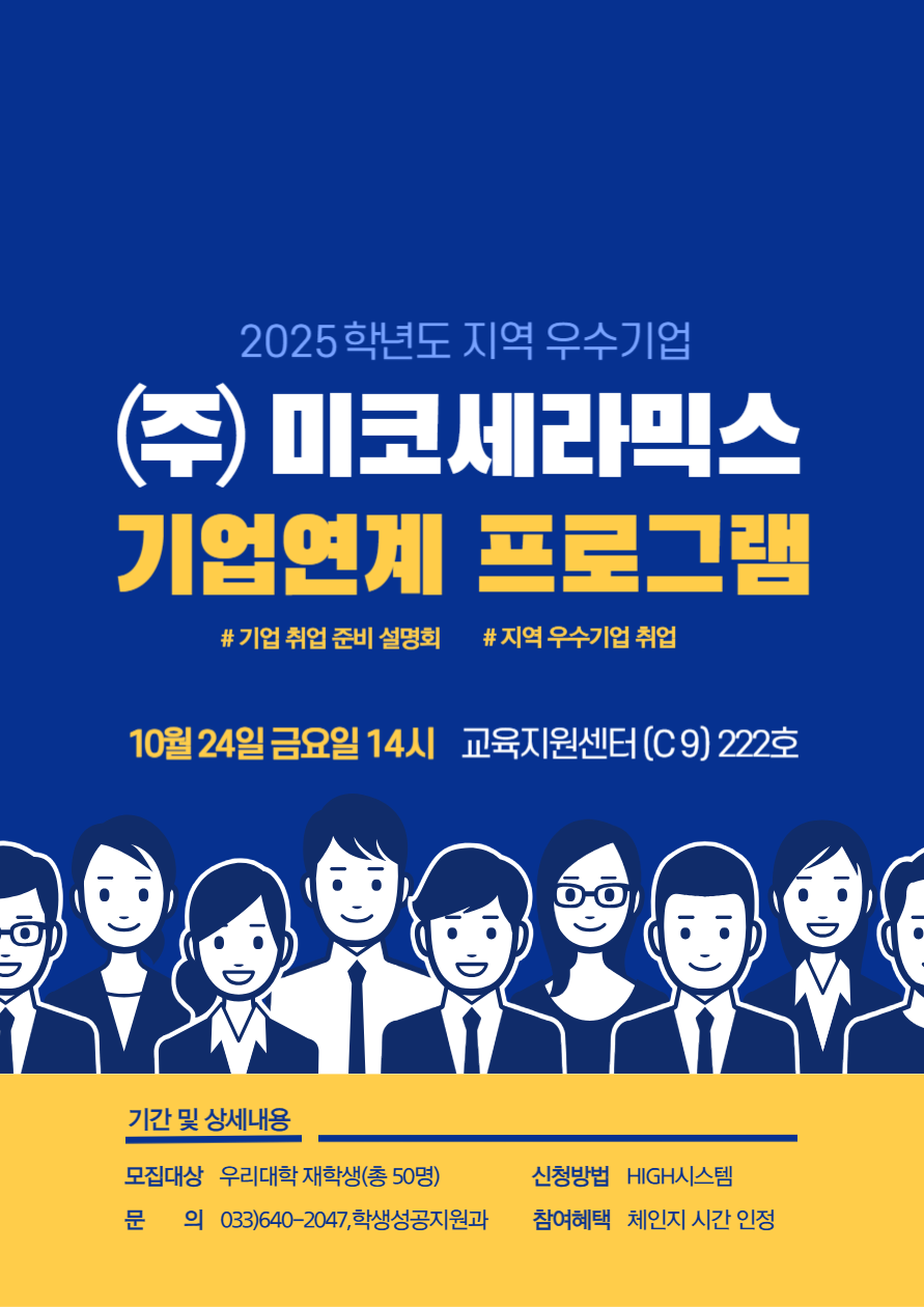 10/24(금) 우리 대학 재학생들을 대상으로 ㈜미코세라믹스 기업설명회를 진행할 예정입니다. 미코세라믹스는 지역 유망기업으로 많은 신청바랍니다.