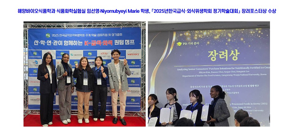 임선영 석사과정생은 「국내 다소비 두류 및 두류 가공품에 함유된 기능성 인지질의 조성 및 함량 연구」를주제로 연구 결과를 발표하였으며, NiyomubyeyiMarie Faustine석사과정생은 「Analysis of Cholesterol Content in Commonly Processed Foods in Korea (2025)」를 주제로 우수한 연구 성과를 인정받았다.