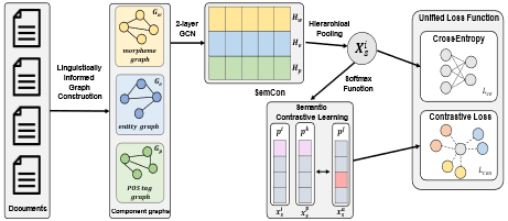 이번 연구에서 제안된 LIGRAM은 한국어 단문 분류의 한계를 극복하기 위한 계층적 이종 그래프 모델로, 한국어의 언어적 특성과 짧은 텍스트의 희소한 문맥 정보를 효과적으로 처리하도록 설계되었습니다. 한국어의 교착어적 특성과 빈번한 조사 및 어미의 생략 문제를 해결하기 위해 형태소, 품사, 개체명 등 세 가지 수준의 하위 그래프를 독립적으로 구축하고 이를 계층적으로 통합하여 정밀한 문법적·의미적 의존 관계를 포착하도록 했다. 특히 본 연구에서는 의미 인식 대조 학습인 SemCon 기술을 도입하여 문서 간의 잠재적인 토픽 분포를 기반으로 유사성을 측정함으로써, 문맥이 부족한 단문에서도 클래스 간의 경계를 명확히 구분할 수 있도록 모델의 변별력을 높였다. 실험 결과 LIGRAM은 KLUE YNAT, 네이버 영화 리뷰 등 주요 한국어 단문 데이터셋에서 기존 최신 모델들을 일관되게 압도하는 성과를 보였으며, 특히 YNAT 데이터셋에서는 기존 최고 모델 대비 정확도를 약 23% 가량 끌어올리는 혁신적인 성능 향상을 입증하였다.