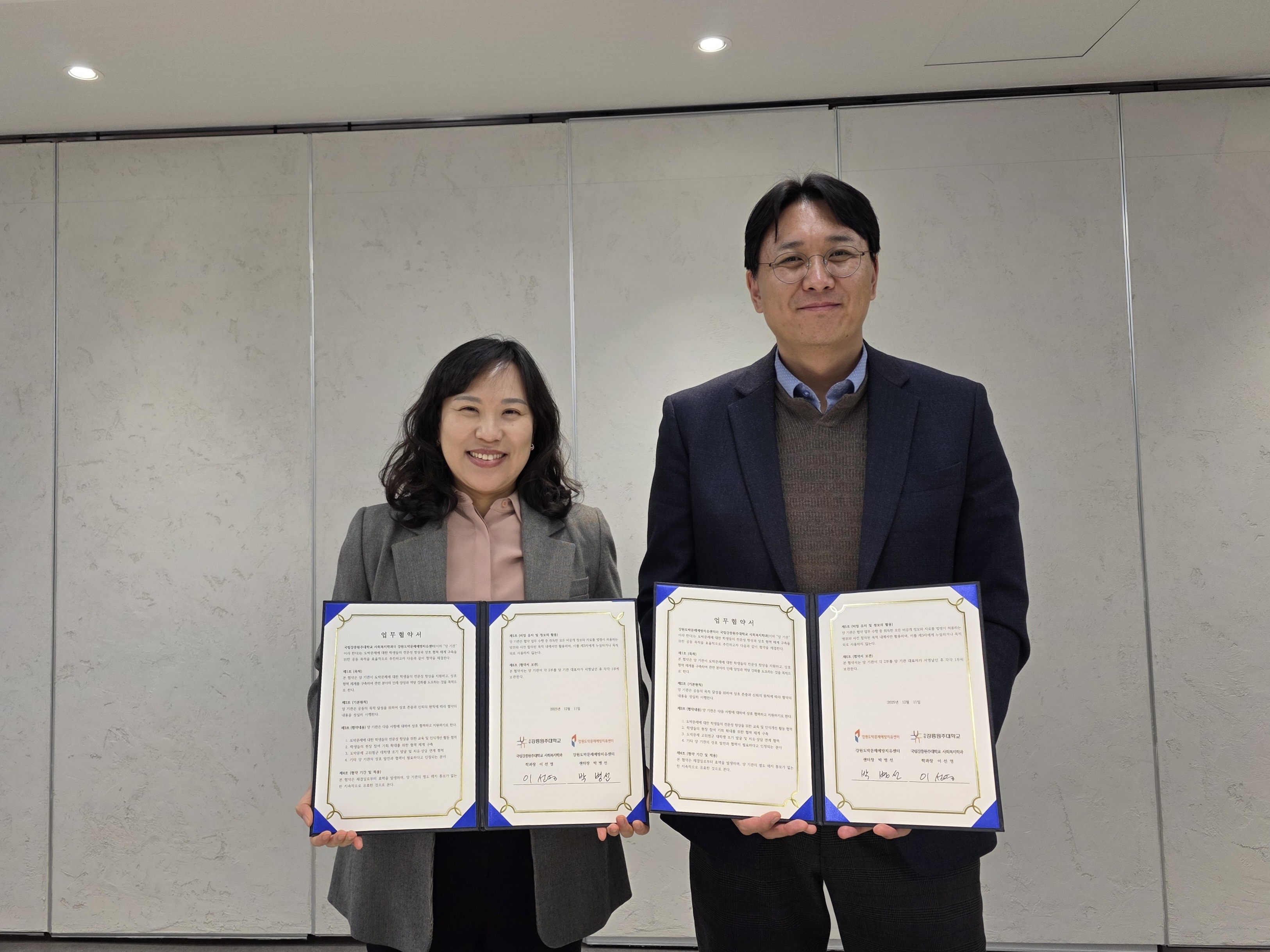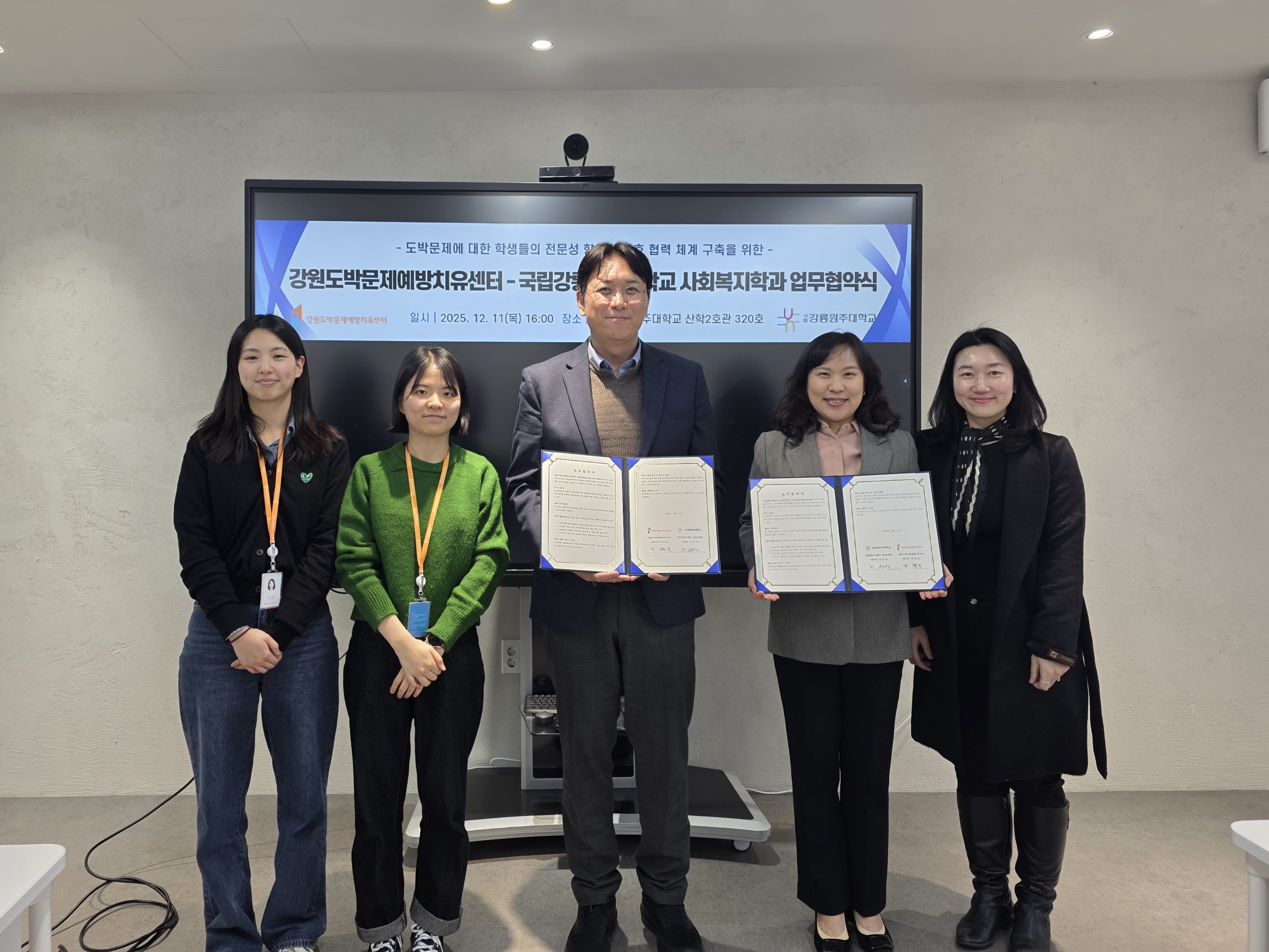 사회복지학과(학과장 이선영)와 강원도박문제예방치유센터(센터장 박병선)는 도박문제에 대한 학생들의 전문성 향상과 상호 협력 체계 구축을 위한 공동 목적을 효율적으로 추진하고자 12월 11일(목) 오후 4시, 원주캠퍼스 현장체험오픈센터(W4) 302호에서 업무 협약을 체결했다.