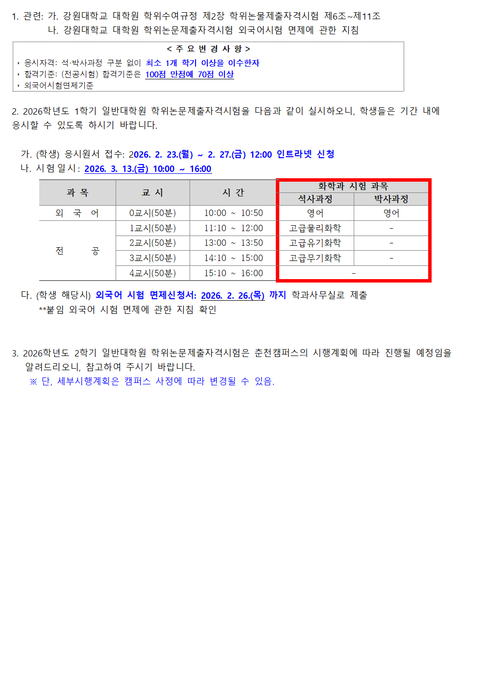 fnctId=bbs,fnctNo=562 [대학원] 2026학년도 1학기 일반대학원 학위논문제출자격시험 실시 안내 작성일 2026.02.19 작성자 진미영 조회수 1235 첨부파일 논문제출자격시험 신청 매뉴얼(학생용).pdf 2026학년도 1학기 일반대학원 논문제출자격시험 시행 계획.hwp 강원대학교 대학원 학위논문제출자격시험 외국어시험 면제에 관한 지침(공지용).hwp 각종서식(외국어시험 면제신청서).hwp