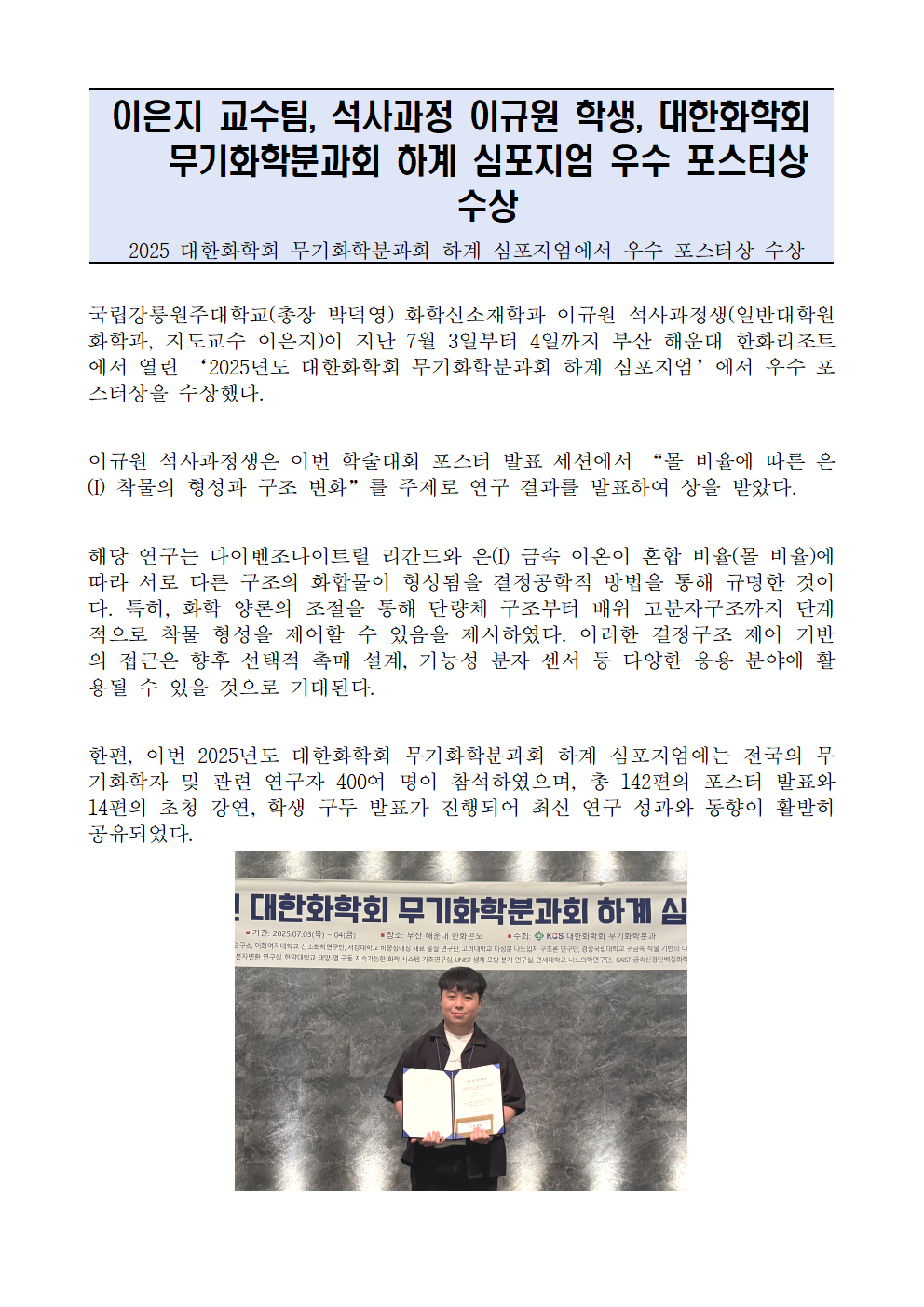 fnctId=bbs,fnctNo=990 이은지 교수팀, 석사과정 이규원 학생, 대한화학회 무기화학분과회 하계 심포지엄 우수 포스터상 수상 작성일 2025.07.08 작성자 진미영 조회수 2672 첨부파일 첨부파일이(가) 없습니다.