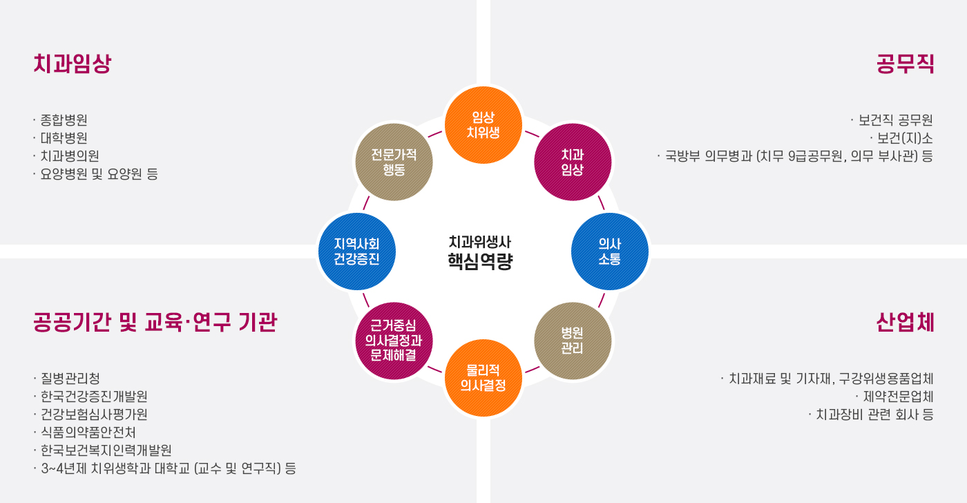 이와 같은 역량기반의 교육과정을 거쳐, 4년 동안 기준학점을 이수하고, 국가고시를 통해 치과위생사 면허증을 취득한 후, 진출 할 수 있는 분야는 아래와 같습니다.
