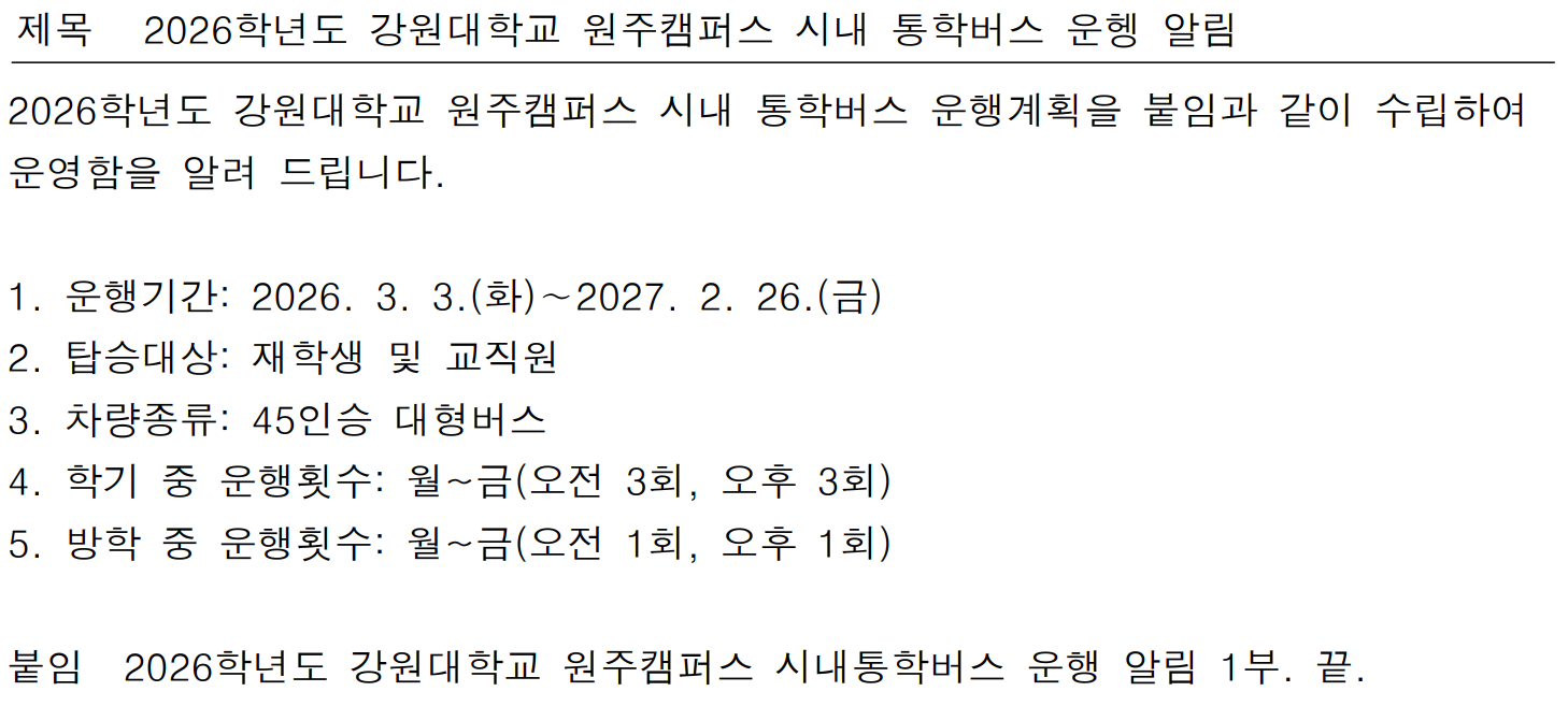 fnctId=bbs,fnctNo=877 2026학년도 강원대학교 원주캠퍼스 시내 통학버스 운행 알림 작성일 2026.03.04 작성자 정하나 조회수 1043 첨부파일 ★(알림) 2026학년도 시내통학 운행알림2026. 3.-5-1.hwp