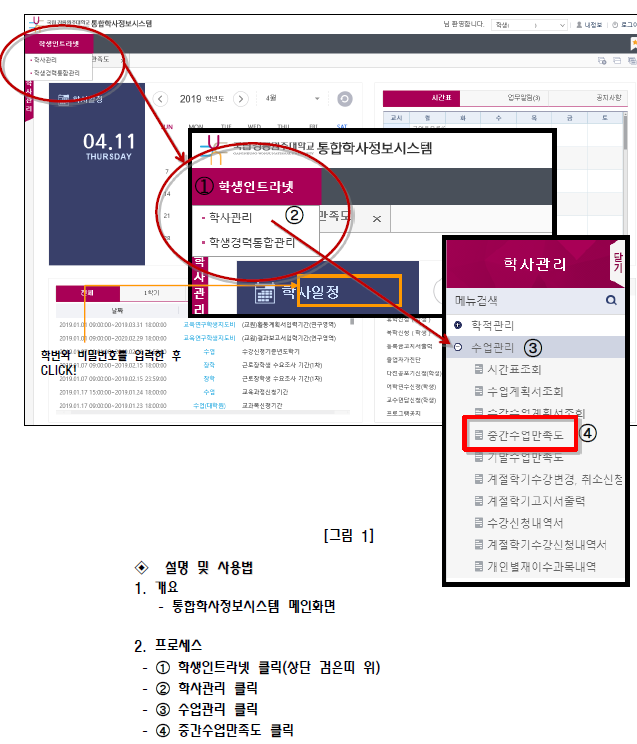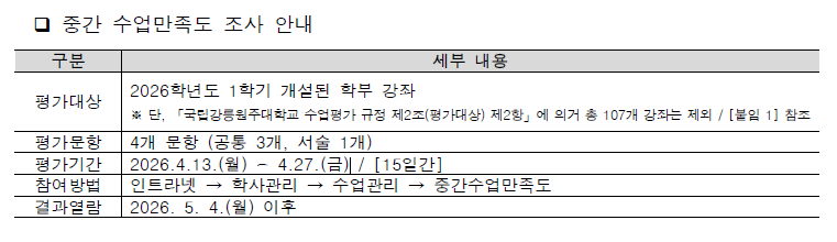 fnctId=bbs,fnctNo=840 2026학년도 1학기 중간 수업만족도(수업평가) 조사 안내 작성일 2026.04.08 작성자 원민정 조회수 312 2026학년도 1학기 중간 수업만족도(수업평가) 조사 안내 첨부파일 2026학년도 1학기 중간 수업만족도(수업평가) 조사 안내 및 협조 요청.pdf 붙임1) 2026학년도 1학기 중간 수업만족도 조사 추진 계획.pdf 붙임2) 2026-1학기 중간수업만족도 조사 안내.hwp 붙임3) 중간수업만족도 매뉴얼(학생용).pdf 붙임4) 국립강릉원주대학교 수업평가 규정.pdf