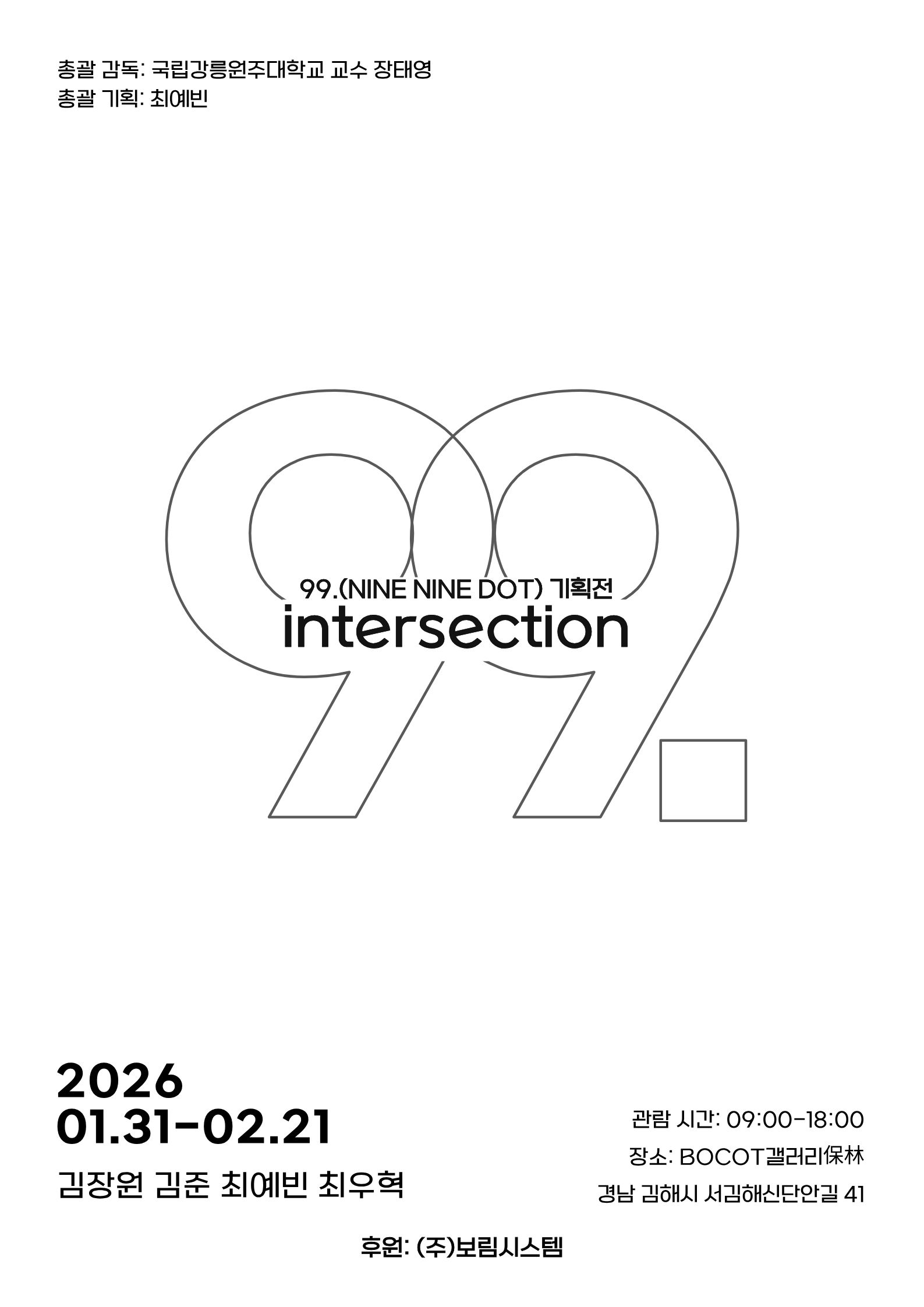 2026 조형예술·디자인학과 99. 기획전 intersection -BOCOT갤러리 保林[조형예술 디자인학과 (한국화 서양화 조소) 99. 기획전 ]장 소: BOCOT갤러리 保林 (경남 김해시 서김해산단안길 41)관람시간: 09:00-18:00관람기간: 22026.02.05 -