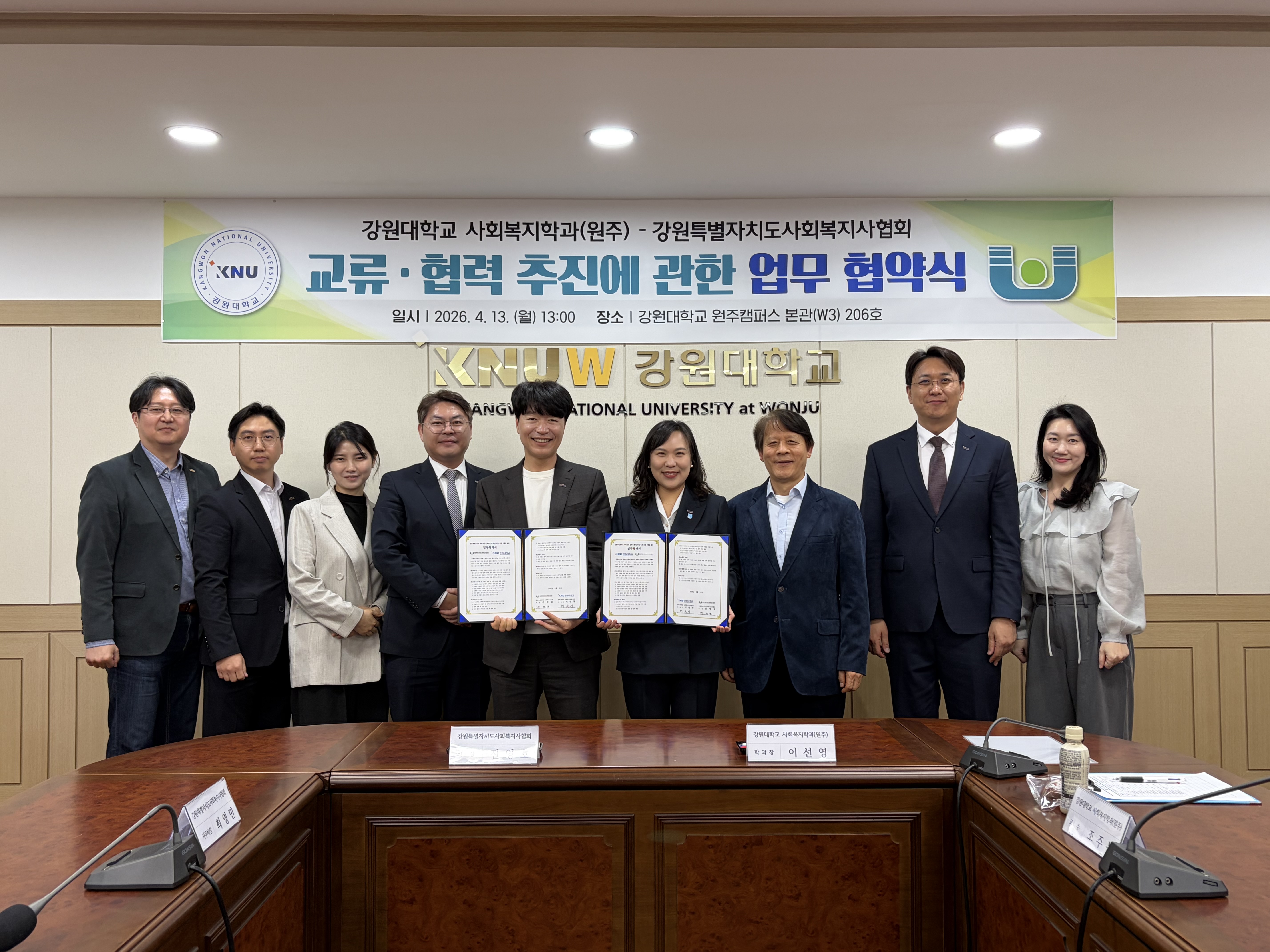 강원대학교 사회복지학과(학과장 이선영)와 강원특별자치도사회복지사협회(회장 진영호)는 2026년 4월 13일 원주캠퍼스에서 「강원특별자치도 사회복지 인력정책 및 청년 정주 기반 구축을 위한 업무협약」을 체결하였다.