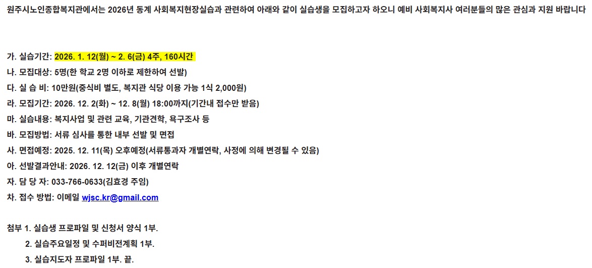 fnctId=bbs,fnctNo=849 [2026-동계] 원주시노인종합복지관 실습생 모집 안내(~12/8) 작성일 2025.11.28 작성자 박아름 조회수 1412 첨부파일 원주시노인종합복지관 2026년 동계 사회복지현장실습 첨부파일.hwp